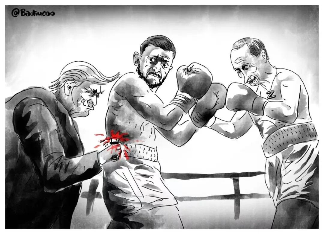由他主持的和谈在美俄之间进行,乌克兰和欧洲甚至都没上桌。他不忘从中为美国捞取好处(乌克兰的资源),不断向受害者施压,却没有一个字提及发动这场战争的普京。