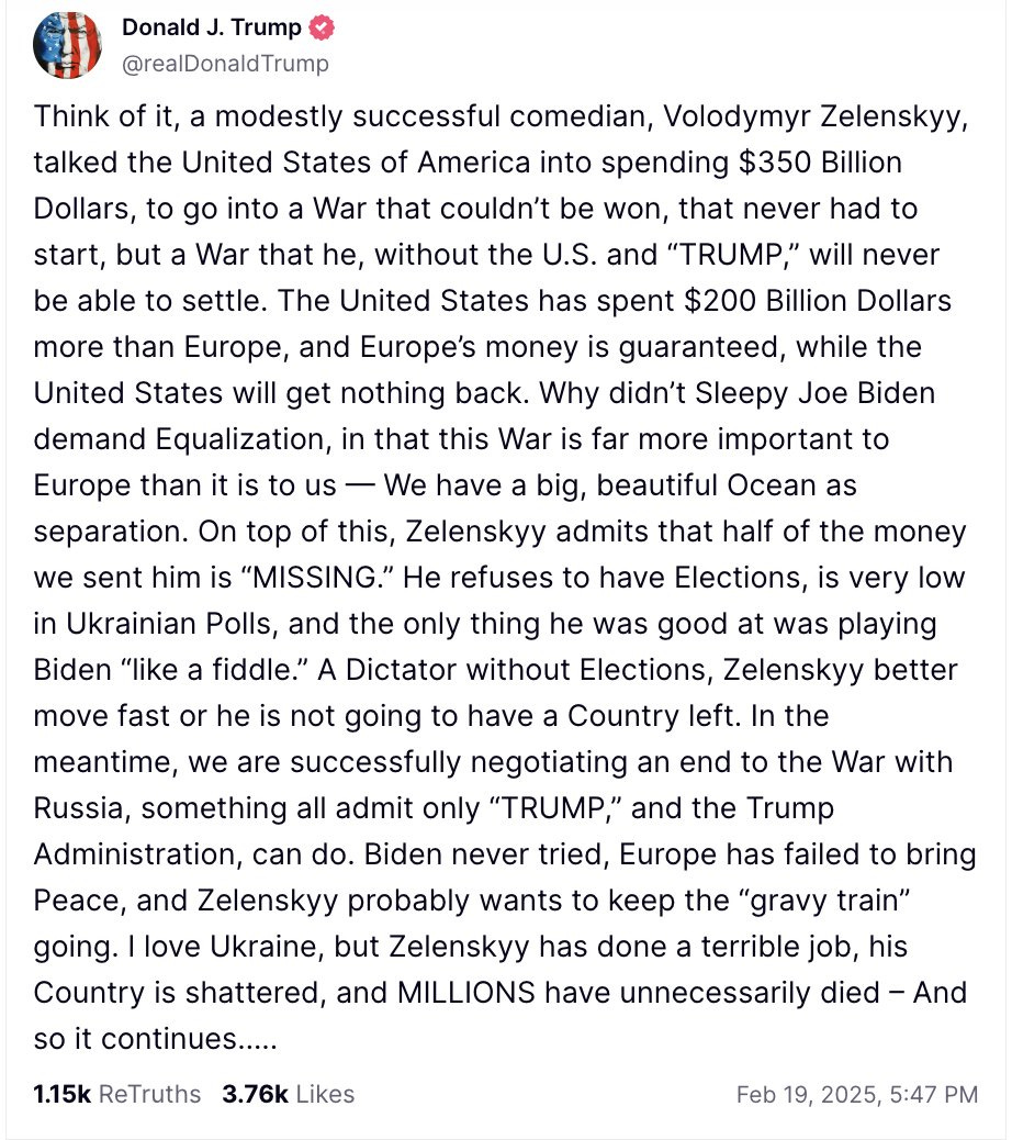 他指责乌克兰总统泽连斯基不得人心(4%的支持率——这当然不是真的),将美国拖入一场不可能获胜的战争,美国花了3500亿美元,却一无所获。当然,他始终不忘夸耀只有他能结束这场战争,威胁泽连斯基如果不屈从,他将“没有国家可言”。